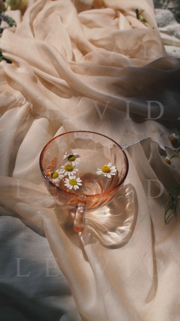 Observe the gentle falling movement of flowers as they collide into a swirling crystalline glass. This mesmerizing, yet subtle visual invites your viewer to slow down into a contemplative state.